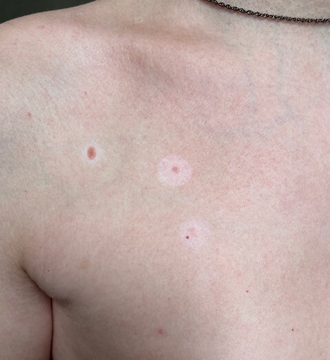 Клиническая картина: невусы однородного цвета, округлой формы с ровным периферическим краем гипопигментации. Центральный невус может быть розового или коричневого цвета. Бессимптомное течение.