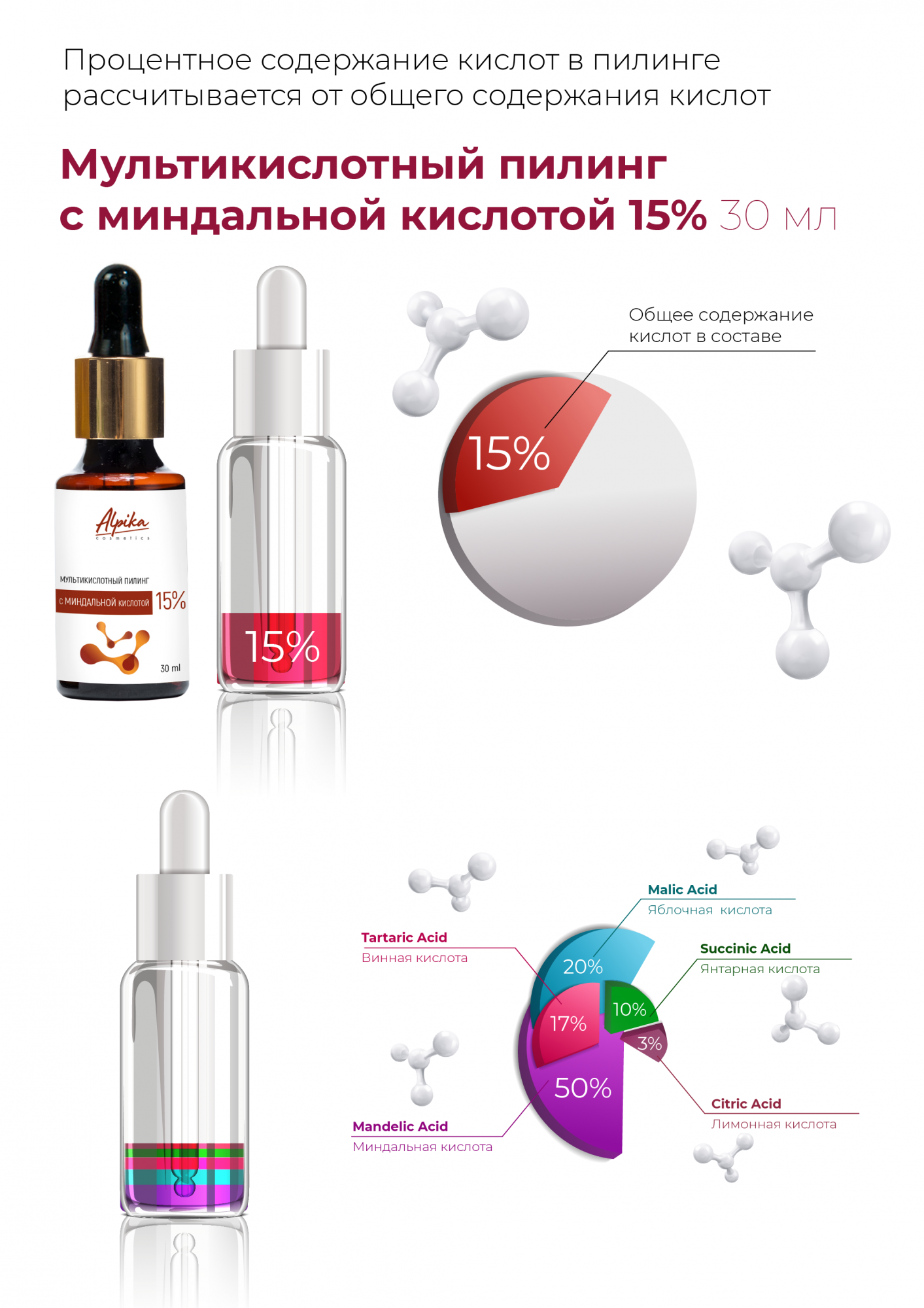 Aqua, Mandelic Acid, Malic Acid, Tartaric Acid, Succinic Acid, Citric Acid. Общее содержание кислот 15%, в том числе: Mandelic Acid 50%, Malic Acid 20%, Tartaric Acid 17%, Succinic Acid 10%, Citric Acid 3%.