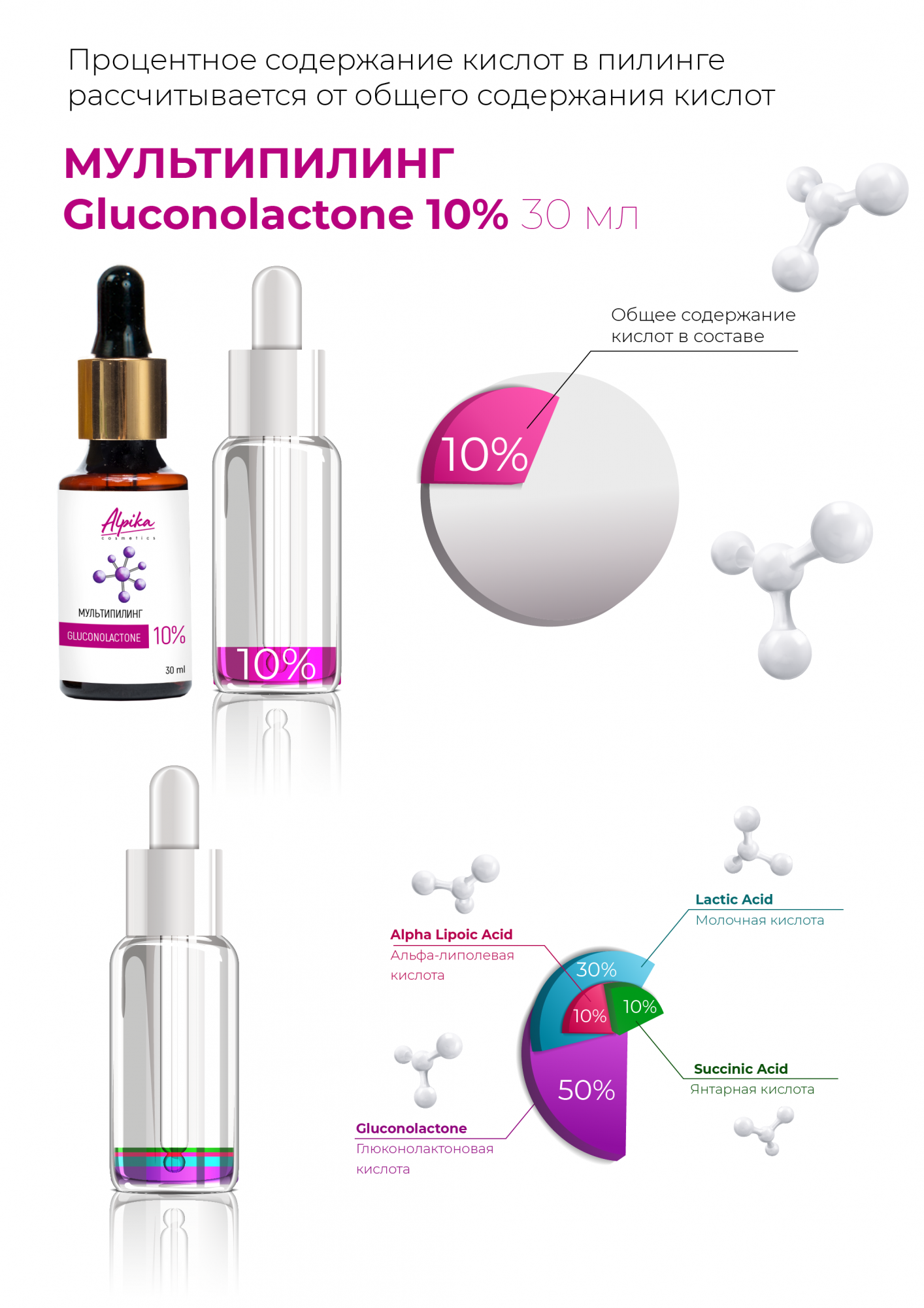 Aqua, Gluconolactone, Lactic Acid, Alpha Lipoic Acid, Succinic Acid. Общее содержание кислот 10%, в том числе: Gluconolactone 50%; Lactic Acid 30%; Alpha Lipoic Acid10%; Succinic Acid 10%.